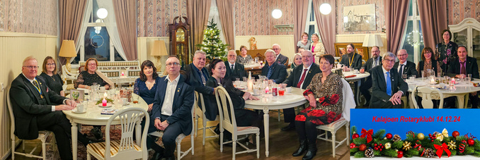 Kalajoen Rotaryklubin jouluruokailu 14.12.24 oli myös klubin 40-vuotistapahtuma, jota klubi vietti perhepiirissä. Avauspuheessaan presidentti Jouni Jyrinki välitti kuvernööri Matias Granvikin ja Rotary Internationalin presidentti Stephanie A. Urchickin onnittelut Kalajoen Rotaryklubille. Presidentin puheenvuoro huipentui rotarymerkin luovutukseen uusille jäsenille Maria Joensuulle ja Esko Heikkiselle. Kunniajäsenet mukaan lukien klubin jäsenmäärä on nyt 27. Maria on lähtöisin Vetelin pelimannipitäjästä ja hänellä sekä hänen lapsillaan on vahva musiikkiharrastus. Läsnäolijat saivat kuulla neljä upeaa viulusooloa sekä lasten lauluesityksen. Klubin perustajajäsen ja ensimmäinen presidentti Heikki Santaholma esitti muistelut klubin perustamisvaiheista sekä toiminnasta matkan varrella. Heikin muistelut julkaistaan täällä nettisivuilla. Vapaassa sanassa mm. Jarmo Ainali muisteli ensimmäistä sihteerikauttaan 1992-93, jolloin rotarybyrokratia oli hyvin työlästä. Käytännöt ovat sen jälkeen huomattavasti helpottuneet. Joululauluja laulettiin Marian johdolla. Tapahtumapaikkana oli Wanhan Pankin juhlatila. Valinta oli onnistunut ja ravintola Mamma Leonen toimittama jouluateria sai runsaasti kiitosta. Klubimestari Pekka oli huolehtinut siitä, etteivät virvokkeet päässeet loppumaan. Lahjojen vaihto ja keskinäinen seurustelu kuuluivat asiaan ja ilta oli jo varsin pitkällä, kun veljet ja sisaret kumppaneineen poistuivat. |
