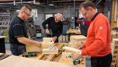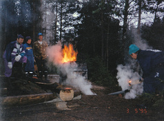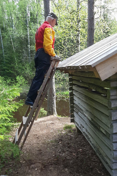 ![]() Näin lähtee vanha laavu, kun puikoissa on Marko Paavola. Laavu siirrettiin ulkotulipaikan eteen. |